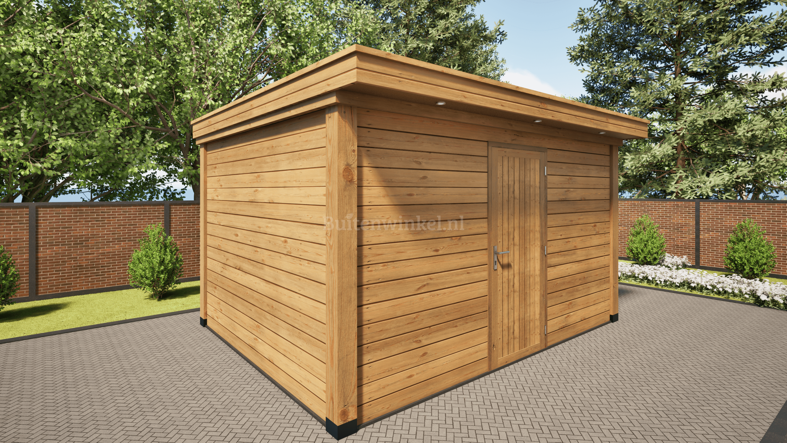 Deze Schuur heeft een buitenwerkse maat van 400cm breed en 300cm diep inclusief overstek van 20cm aan de voorzijde.