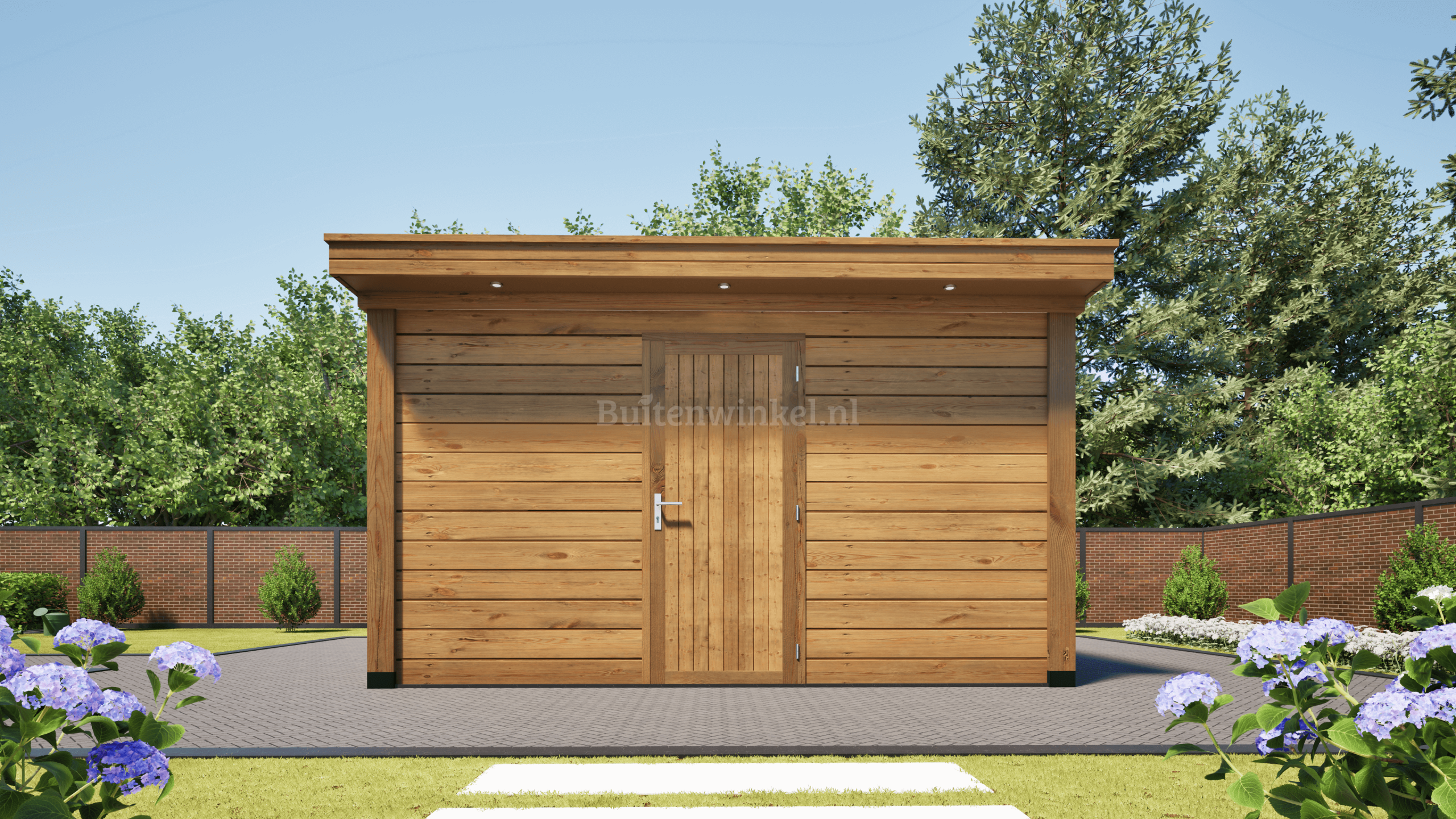 Deze Schuur heeft een buitenwerkse maat van 400cm breed en 400cm diep inclusief overstek van 20cm aan de voorzijde.